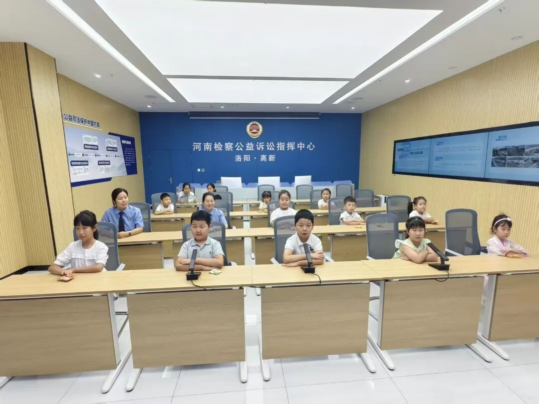 在公益诉讼指挥中心,孩子们端坐在屏幕前感受视频连线工作场景;院史馆里,泛黄的老照片与闪亮的奖杯诉说着检察历程,有孩子兴奋地指着照片:“看!那是我妈妈!”走进图书室,满墙的法律典籍引发了孩子们的好奇提问;党建室内,干警用简单的故事讲述着责任与担当。