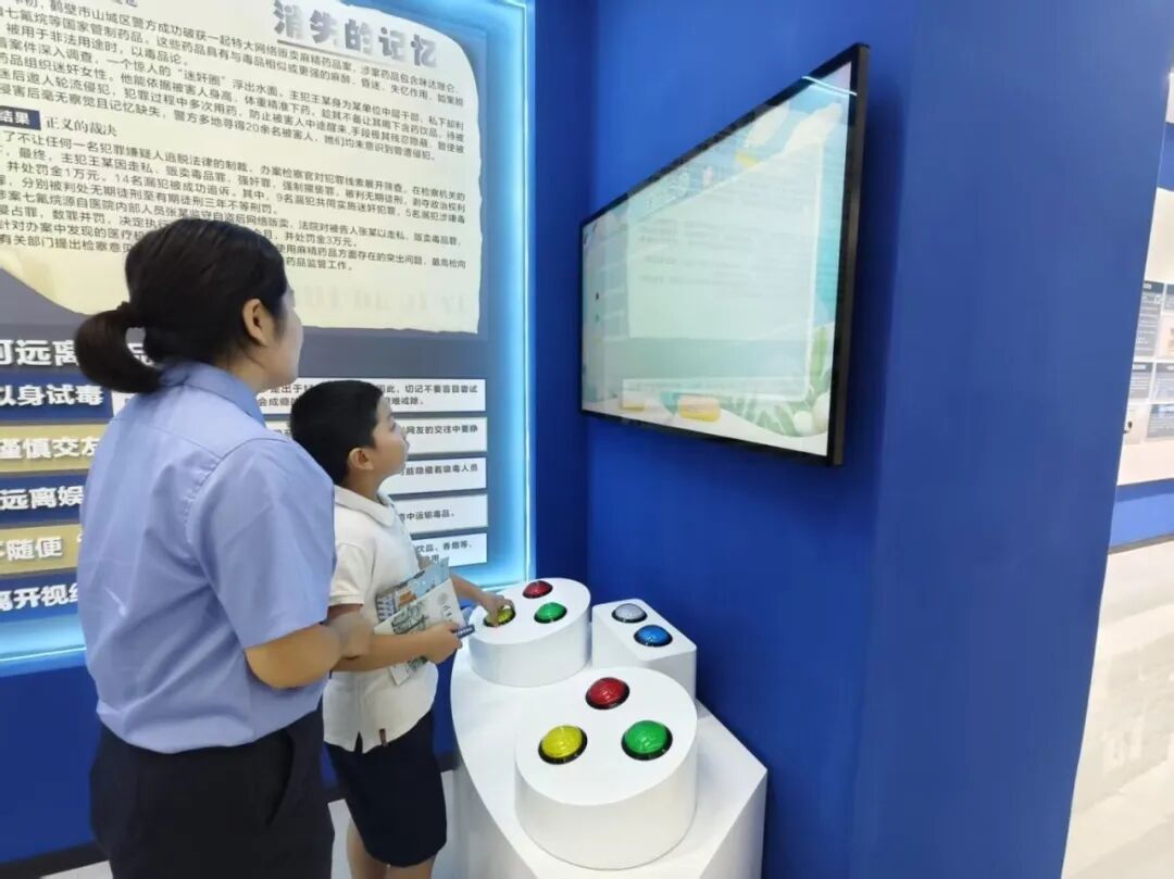 在“未爱护航”展区,这里设置了“拒绝毒品诱惑”、“应对校园欺凌”等模拟场景。孩子们兴致勃勃地参与互动:在识别娱乐场所风险的环节,大家争相指出“不良场所”;面对“伪装毒品骗局”的情景,开动脑筋识破陷阱。