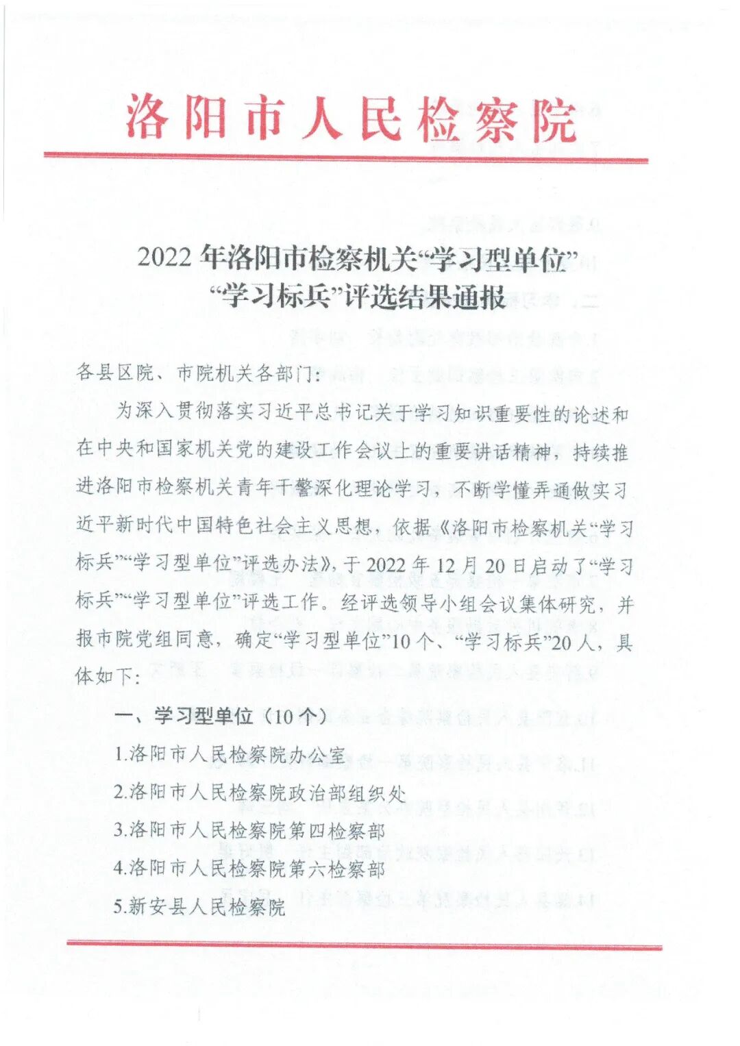 近日,从《2022年洛阳市检察机关“学习型单位”“学习标兵”评选结果通报》中获悉,我院喜获“学习型单位”称号,我院干警李玉凯荣获“学习标兵”荣誉。